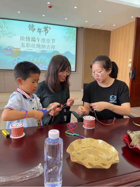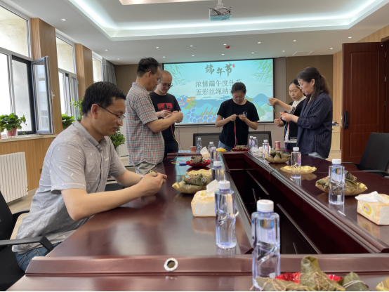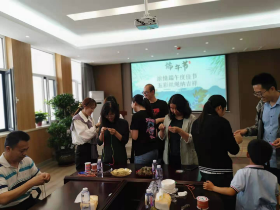 大家品尝美味粽子感受佳节氛围。通过分享家乡欢度端午佳节习俗,大家对应劭《风俗通》中“五月五日,以五彩丝系臂”的记载有了更深刻的理解,中国古代崇拜五色,以五色为吉祥色。因而,每年的农历五月初五端午节清晨,各家大人起床后第一件大事便是在孩子手腕、脚腕、脖子上拴五色线,保安康。最后,老师们亲自动手,为家人和同事编织五彩绳纳吉祥,体验劳动乐趣,放松心情,送出祝福,欢度佳节。