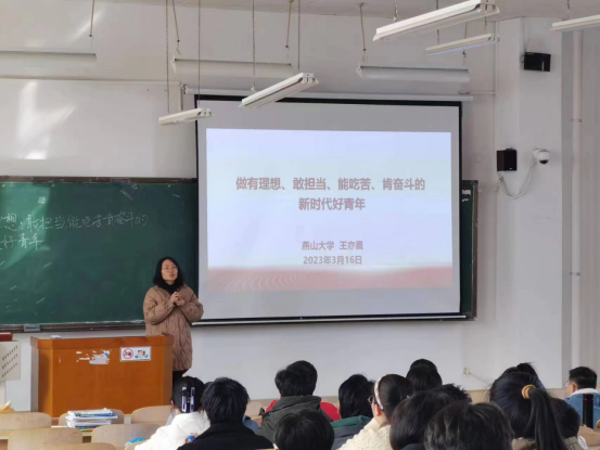 王亦晨老师以党的二十大报告主题为切入点,以习近平总书记在党的二十大上的报告中对广大青年提出的“立志做有理想、敢担当、能吃苦、肯奋斗的新时代好青年”重要要求为中心,通过讲述青年始终是实现中华民族伟大复兴的先锋力量;新征程上,青年的使命与担当;做有理想、敢担当、能吃苦、肯奋斗的新时代好青年三部分内容,激励作为新征程上的青年,要深刻认识自身所肩负的时代使命,增强历史主动精神,达到高度自觉。希望广大青年:首先要有坚定远大的理想信念,明确奋斗目标;其次要勇担时代赋予的大任,增强使命意识;第三要树立吃苦耐劳精神,激发劳动欲望;最后还要培育团结奋斗品质,练就过硬本领。作为新时代中国青年,在享受着优越的物质条件,可以做出更多的个人选择之时,一定要坚定理想信念、勇担时代大任、树立吃苦耐劳精神、培育团结奋进品质。