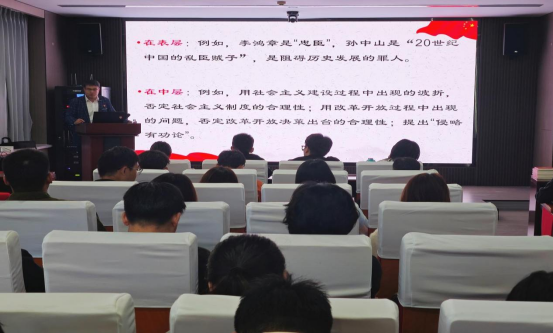 新办公楼113会议室以《自觉辨析意识形态领域的七种错误思潮》为主题,为学院16名发展对象和42名学生党员讲授专题党课。