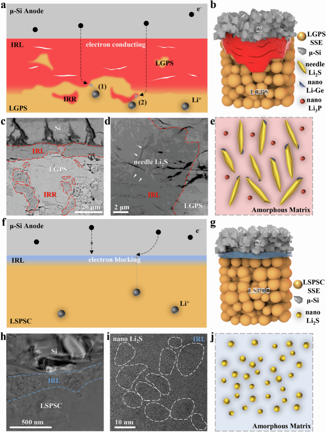 研究团队创新性地应用Cryo FIB-TEM(低温聚焦离子束-透射电子显微镜)技术,首次在原子尺度上揭示了两种截然不同的界面反应机制。Si/LGPS界面会形成一层厚达10-20 μm、充满裂纹的混合离子电子导体层,其包含针状Li₂S晶体、电子导通的Li-Ge及Li₃P纳米晶,其中大尺寸的Li2S来自于其与Li-Ge之间的半共格关系。相反,Si/LSPSC界面则生成一层仅100-200 nm厚、均匀致密的纯离子导体层,由Li₂S纳米晶均匀弥散分布于非晶基质中构成。尽管界面层成分均为Li2S,但由于纳米化的Li-Ge与Li3P的镶嵌,Si/LGPS界面层电子电导率为1.17×10-5mS/cm,是Si/LSPSC界面层的电子电导率上百倍,这也是导致前者持续的副反应和活性锂不可逆消耗的根本原因。本研究的关键在于颠覆了传统认知,证实硅与硫化物电解质化学相容性良好,电池失效的主因并非界面阻抗过高,而是由界面反应产物的导电性质所决定的持续活性锂损失机制。