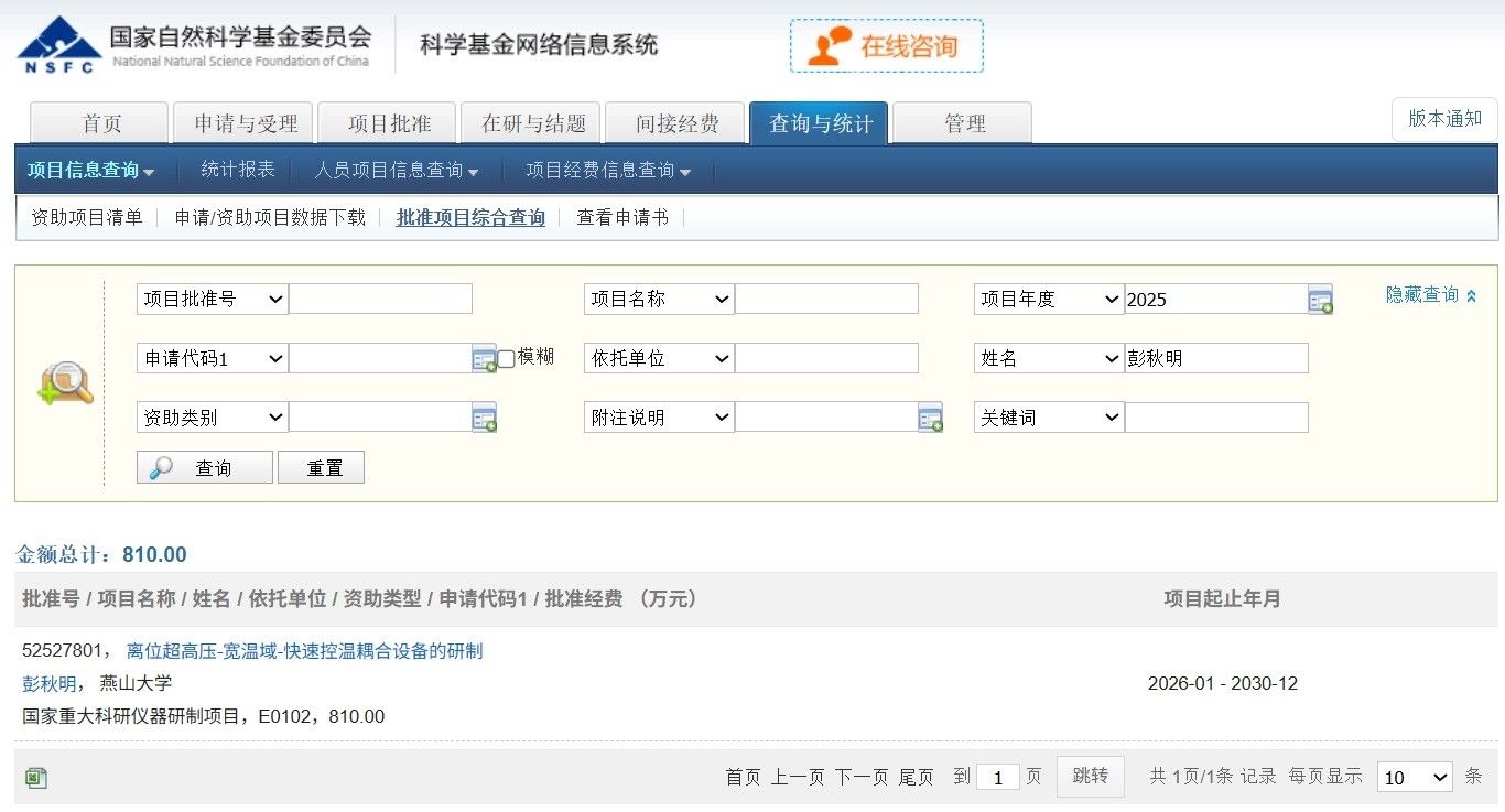 近日,国家自然科学基金委员会正式公布了国家重大科研仪器研制项目的立项结果,由实验室彭秋明教授主持申报的“离位超高压-宽温域-快速控温耦合设备的研制”项目成功获批,项目直接经费为810万元。这是继实验室2021年首次获批该类项目后,在国家级重大科研仪器研制领域的又一持续突破,标志着实验室在相关前沿科学领域的原始创新能力和技术研发实力得到了国内同行专家的持续高度认可。