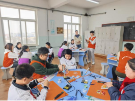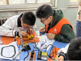 随后,在宣讲团的指导帮助下,学生们迅速投入到焊接电路板、装配小车机械部件的实践操作中。从最初的小心翼翼到逐渐熟练,他们以焊枪为笔,焊锡为墨,在电路板上绘出电路之画。整个过程中,学生们不仅锻炼了动手能力,更在实践中体会到了科学的魅力和乐趣。