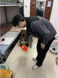 在消杀的同时,志愿者们也对同学们进行了安全提示,提醒大家在消杀期间要注意个人防护,避免接触消杀用品,日常生活要勤洗手、多通风,保持个人良好卫生状况。这一系列细致入微的工作安排,为消杀活动的顺利开展奠定了坚实的基础,也为同学们的健康安全提供了有力保障。