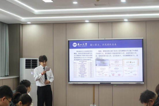 姜明金首先对本次评选条件、评选程序及评选办法进行了详细介绍。6名参评省优个人评选的学生依次通过PPT展示的方式,分享了他们在思想引领、专业学习、文体活动、创新创业、社会实践以及志愿服务等多方面的卓越成就与深刻感悟。他们是目标坚定、矢志不渝的追梦人,也是热心公益、无私奉献的志愿者。他们或在各类竞赛中摘金夺银,或在创新创业道路上勇立潮头。经过公开、公平、公正的评选,最终拟推荐2023级硕研1班硕士研究生遇世程、2022级材料物理1班本科生周宸弘、2022级硕研1班和2021级热处理1班等个人和集体参评学校省优评选的进一步角逐。