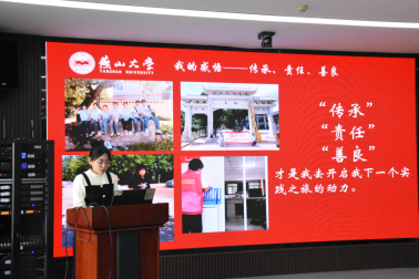 比赛现场气氛热烈,同学们都尽自己最大的努力展示出最青春的风采。选手分成奋楫领航组、学研拓新组、践悟志行组、自强逐梦组,围绕“榜样力量”主题展开比拼,尽显当代青年的蓬勃朝气与昂扬斗志。奋楫领航组着眼时代发展的浪潮,讲述着在各领域勇立潮头的榜样故事。从中国共产党的奋斗探索到科技创新的先锋开拓再到大学生村官的成长实践,他们的分享将理论具象化,引导同学们感悟榜样人物的奋斗历程,筑牢理想信念根基,将社会主义核心价值观内化于心、外化于行,在逐梦路上绽放青春光彩。