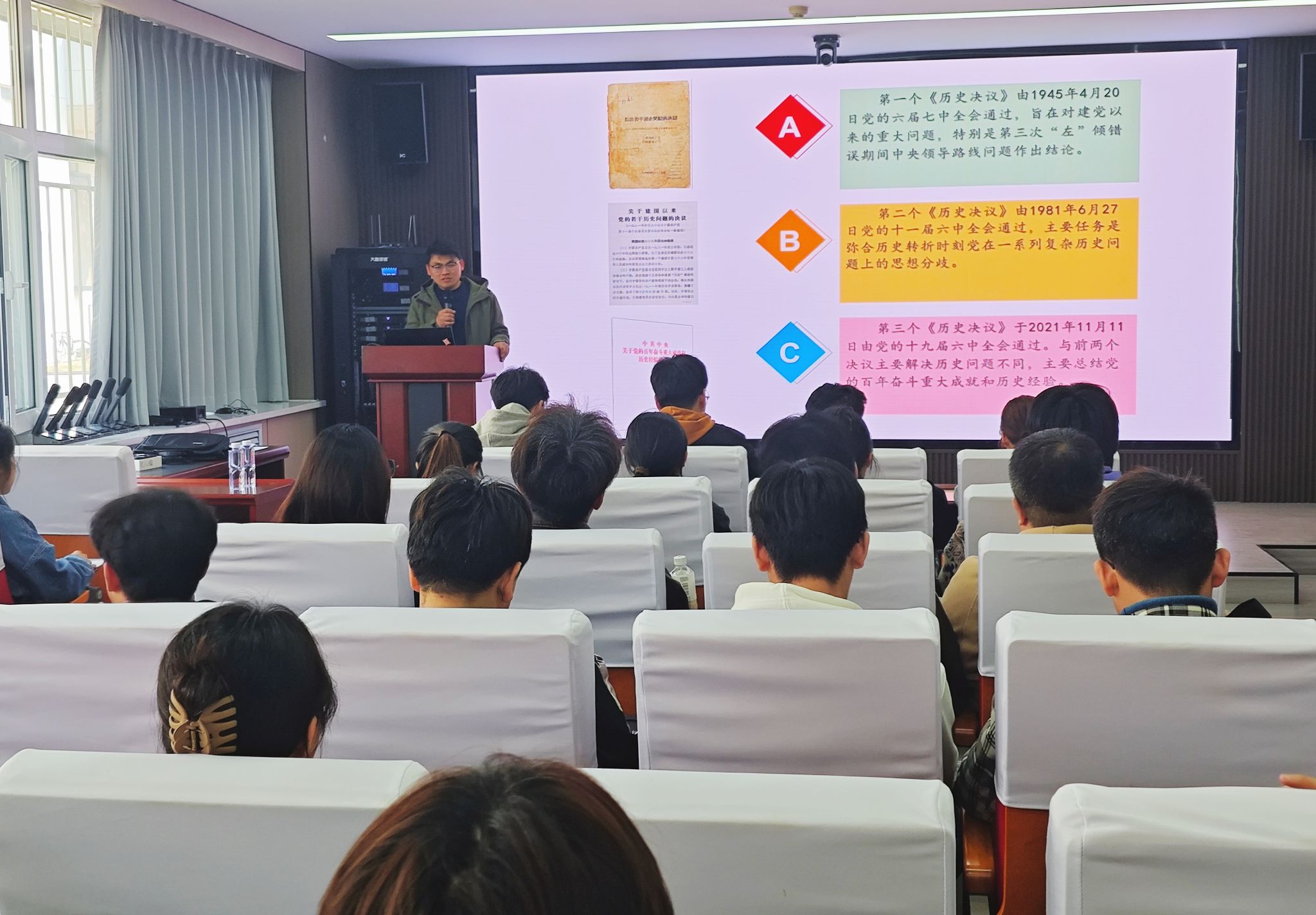 行政楼113会议室以《三个历史决议与中国共产党总结历史经验的基本方法》为主题,为学院24名发展对象和41名学生党员讲授专题党课。