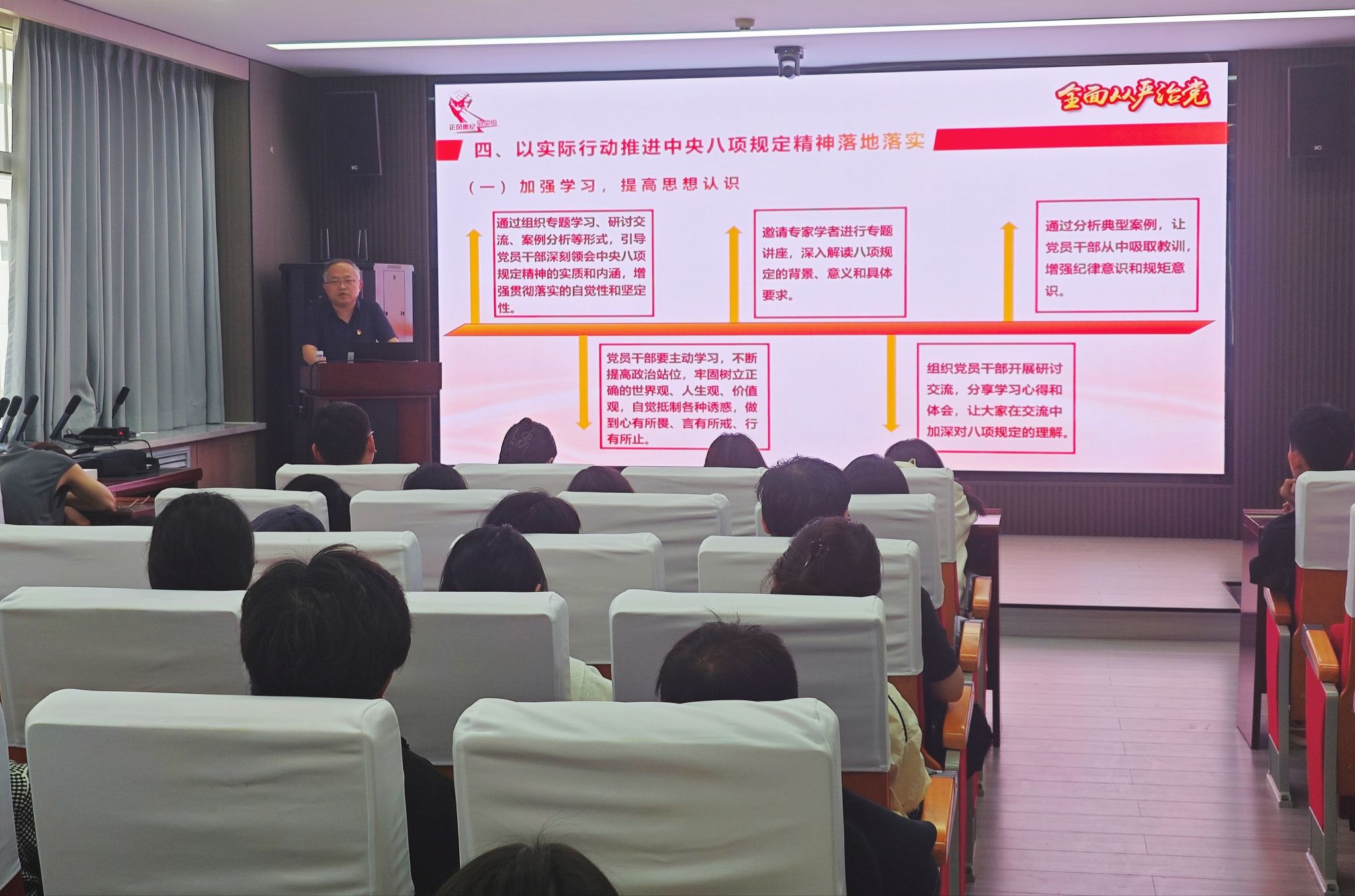 行政楼113会议室以《从违纪违法典型案例中深刻反省,推进中央八项规定精神落地落实》为主题,为学院130名学生党员、入党积极分子讲授专题党课。