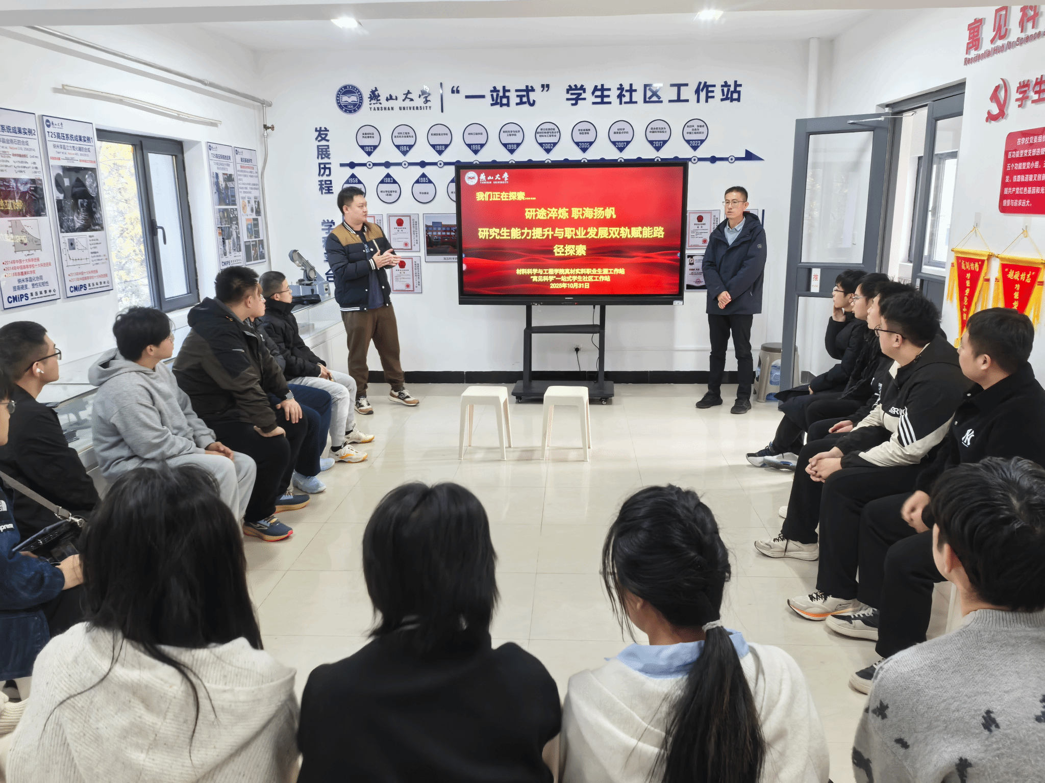 特邀2008级金属专业校友、中信戴卡股份有限公司工程技术研究总院科长、高级工程师王佶,在“寓见科学”一站式学生社区工作站开展“研途淬炼职海扬帆--研究生能力提升与职业发展双轨赋能路径探索”主题分享,活动由金属材料工程系主任李艺君老师主持。